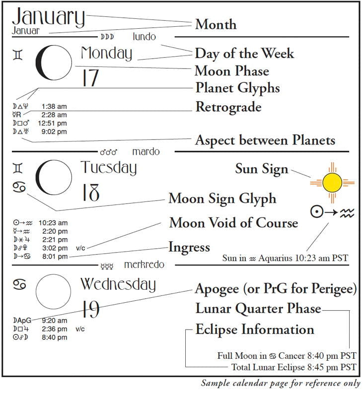 We'Moon, the best-selling Moon Calendar and visionary collection of art and writing by creative women from around the world We'Moon has been the best daily astrology guide and go-to moon phase planner for over four decades! A perfect companion for tracking full and new moons, finding out what sign the moon is in, following the moon phases, daily astrological aspects and so much more! Whether you are new to astrology or a professional astrologer, this lunar planner has in-depth articles, detailed astrological data, helpful tips for beginners, and wonderful art and writing to inspire you on your daily journey. Each year We'Moon weaves threads of intention into this beloved astrological moon phase calendar.