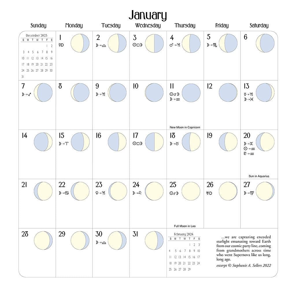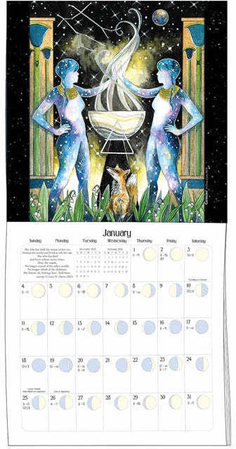 We’Moon on the Wall is a beautiful full-color moon phase calendar with the major astrological transits, Sun & Moon signs, and more Our wall calendar features exquisite women's art and inspirational writings from the We’Moon astrology planner, complete with daily moon phases and signs, notations for each pagan holiday and key astrological information and articles. We'Moon on the Wall is a simplified version of the datebook, featuring 12"x 12" reproductions of a vibrant work of art for each month, selected from the 150+ pieces published in the datebook. It is a Month-at-a-glance Moon Phase Calendar showing the Moon phases for each day, graphically illustrated in light blue and yellow color tones to indicate when the Moon is Waxing or Waning, light enough to make any notations you write on the calendar still visible.