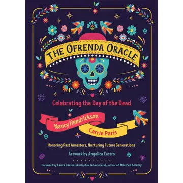 Welcome to The Ofrenda Oracle, a bilingual deck and guidebook inspired by el Día de los Muertos—the celebration honoring the Beloved Dead During the annual (traditionally Mexican) Día de los Muertos celebration, the family members of a person who has died will place items with special significance on a home altar in order to welcome the deceased. This ofrenda, or offering, may be quite large and elaborate. The initial inspiration for this deck came from San Diego’s close association with Mexico and this yearly celebration of the Dead that typically runs from October 31 through November 2. From those vivid images and joyful celebrations came the idea for this kit of colorful cards. The Ofrenda Oracle includes a sixty-card deck and a 136-page guidebook. The cards and booklet are printed in both English and Spanish. The first thirty-six cards mirror those found in a Lenormand deck and can be used on their own as a stand-alone deck. The additional cards depict the vibrant symbolism see