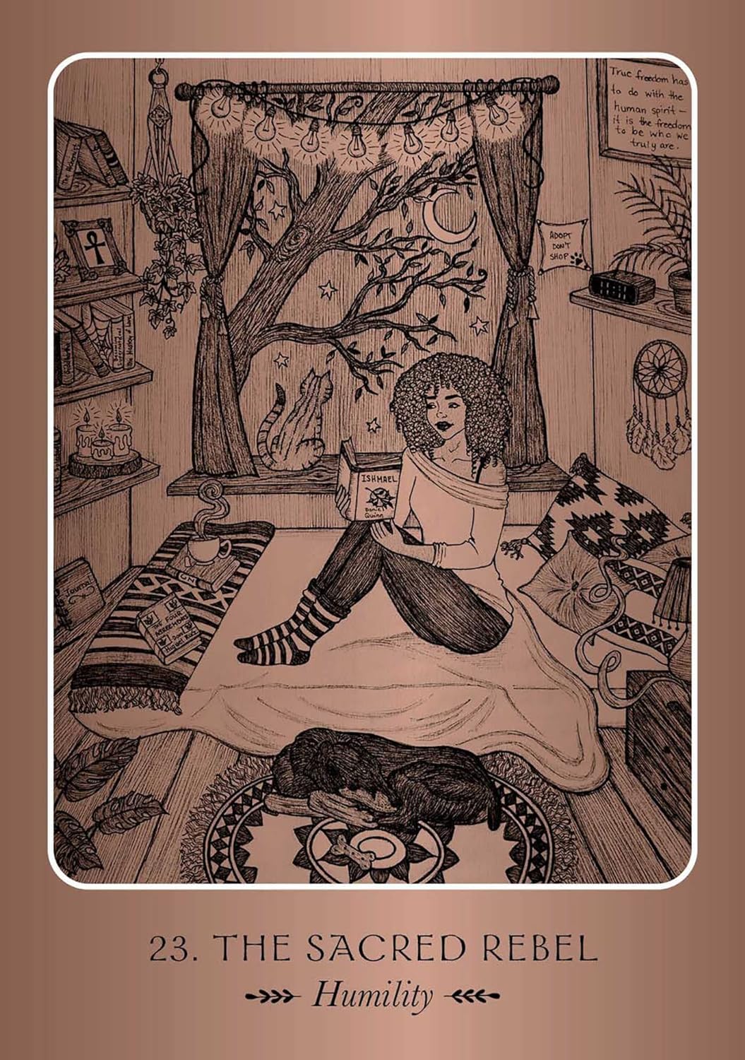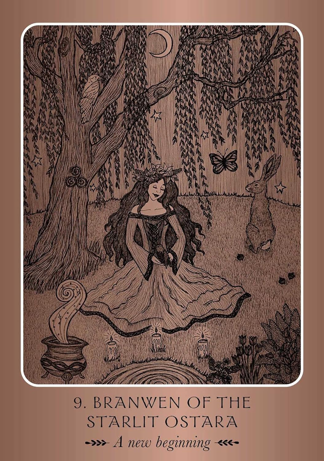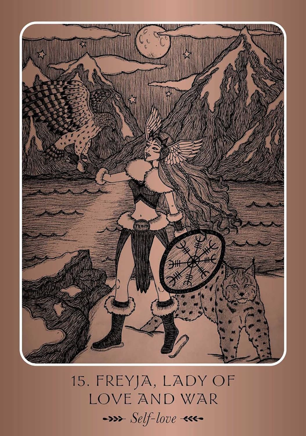 The images on the 44 cards depict strong feminine figures from mythology, folklore, and contemporary culture—all women who faced their own struggles and victories, and whose example will inspire others to discover their true self.  The artwork was created in pen and pencil and reproduced in shades of black printed with bronze metallic ink to enhance their dark and mystical feel.