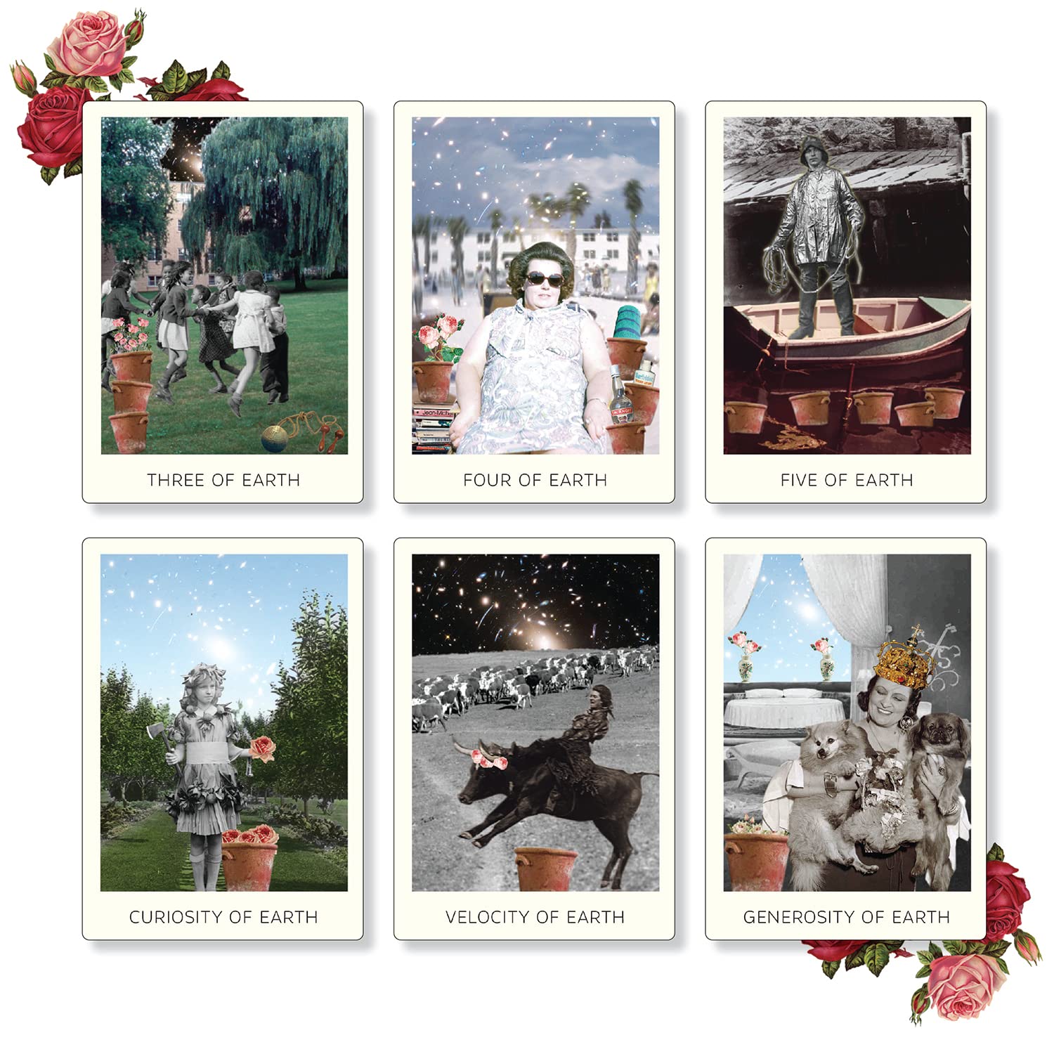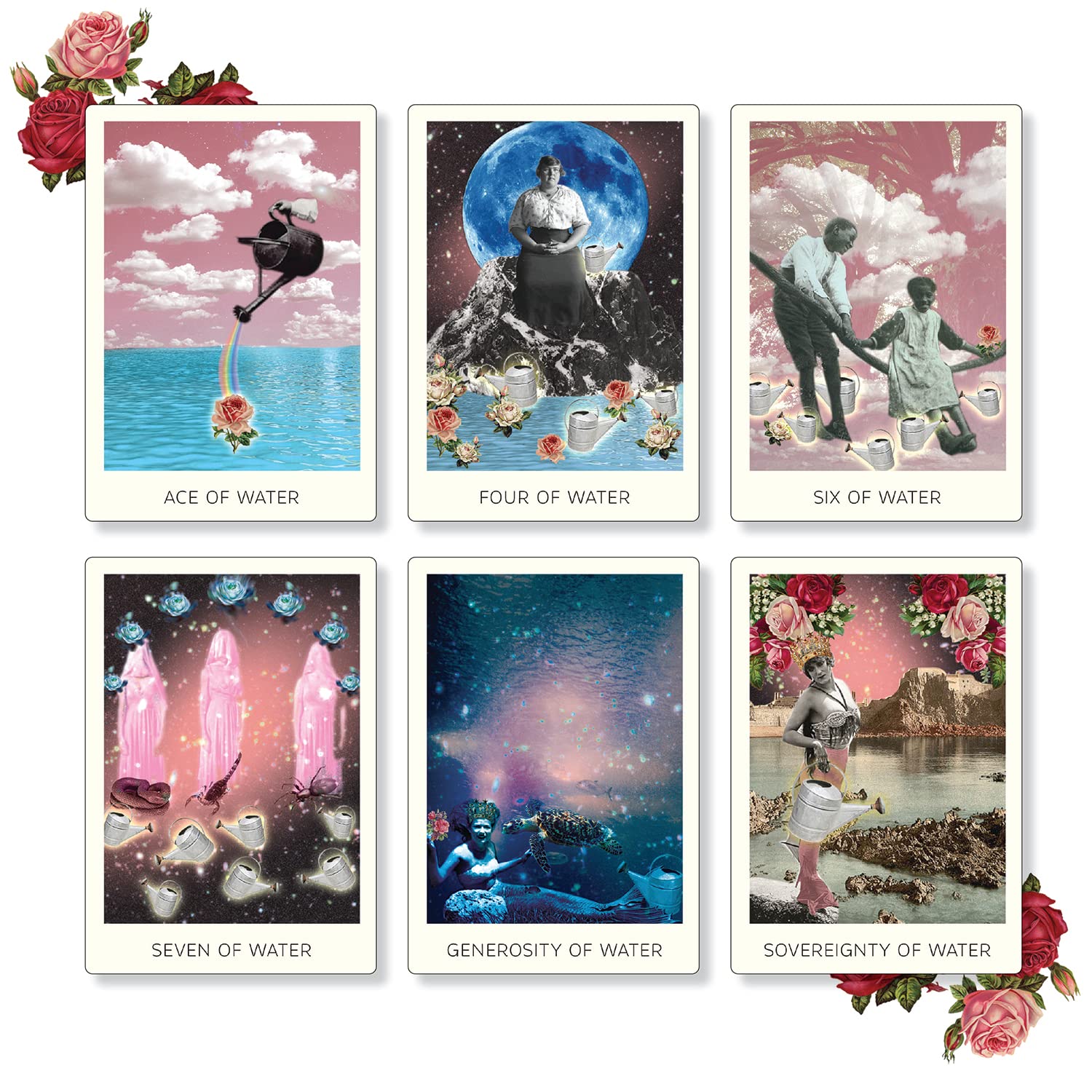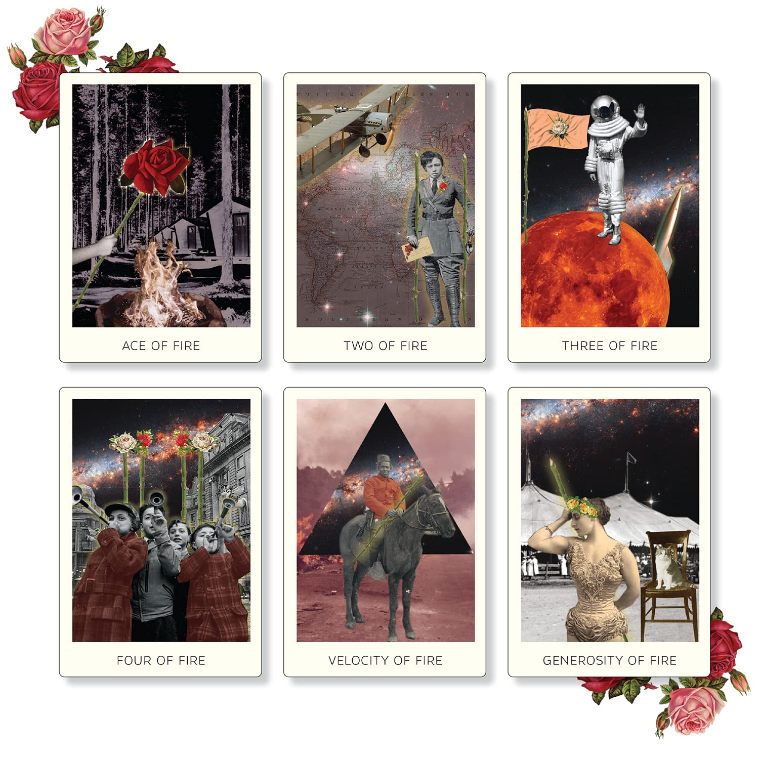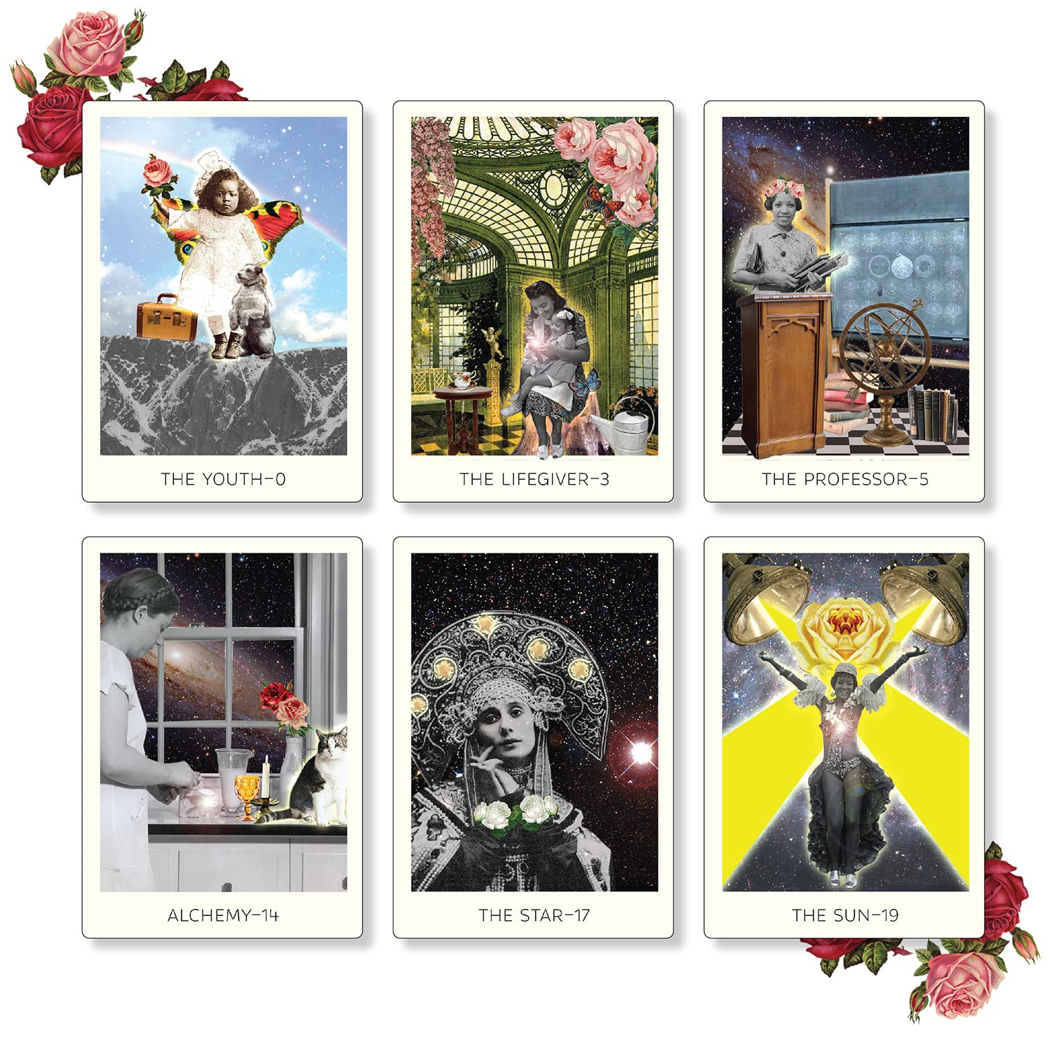 The rose is a through line in The Rosebud Tarot, a rose-gold thread weaving its way into each line of the Major Arcana and into the heart of every Minor. The playfulness and sharp edges of the rose shimmer through every reading, each card’s dream-layer collage a petal of insight.