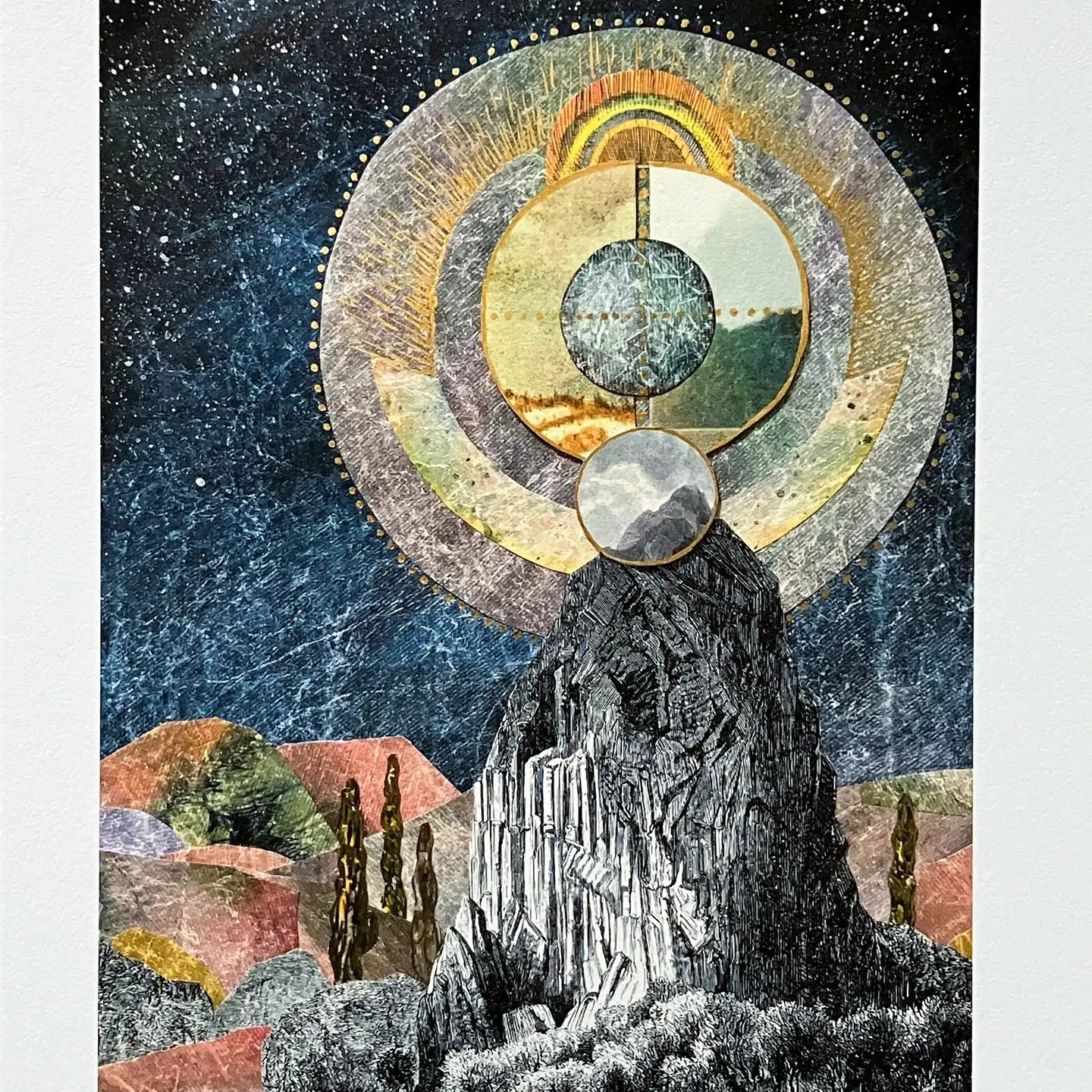 Most of my pieces are built up on panels or canvas using multiple layers that may include paint, charcoal, antique and decorative papers, thread, fabric, gold leaf, wax, pencil, and crayon.